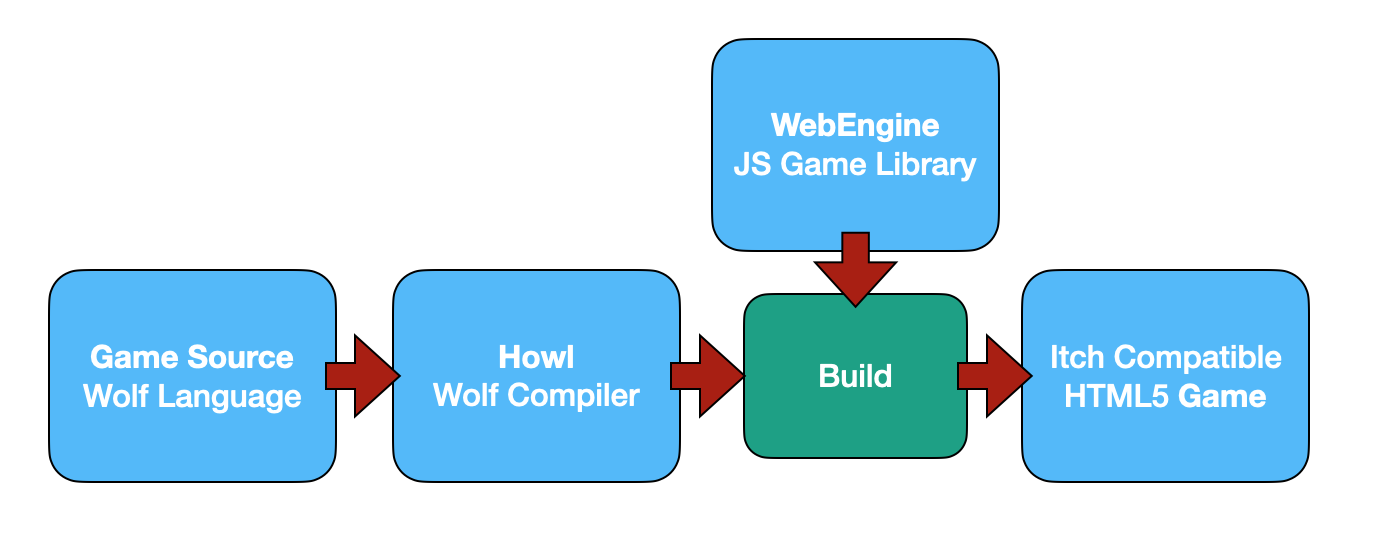 A challenge to design a programming language, then write a game in that language. I decided to do everything from scratch without any GenAI. I wanted a complete project rather than an overly fancy language or game that I would never finish. I kept simplifying until I had a plan that I could complete in the ~10hours I had. I designed a language that I call Wolf. I wrote an optimizing compiler for it called Howl. The compiler is written in Haskell and uses Megaparsec. I wrote a game library in Javascript. The compiler parses the game source, does some token optimisations in IR, then writes out Javascript with functions mapped to the game library. The build system assembles the pieces and builds a zip file for Itch. There is a diagram here: