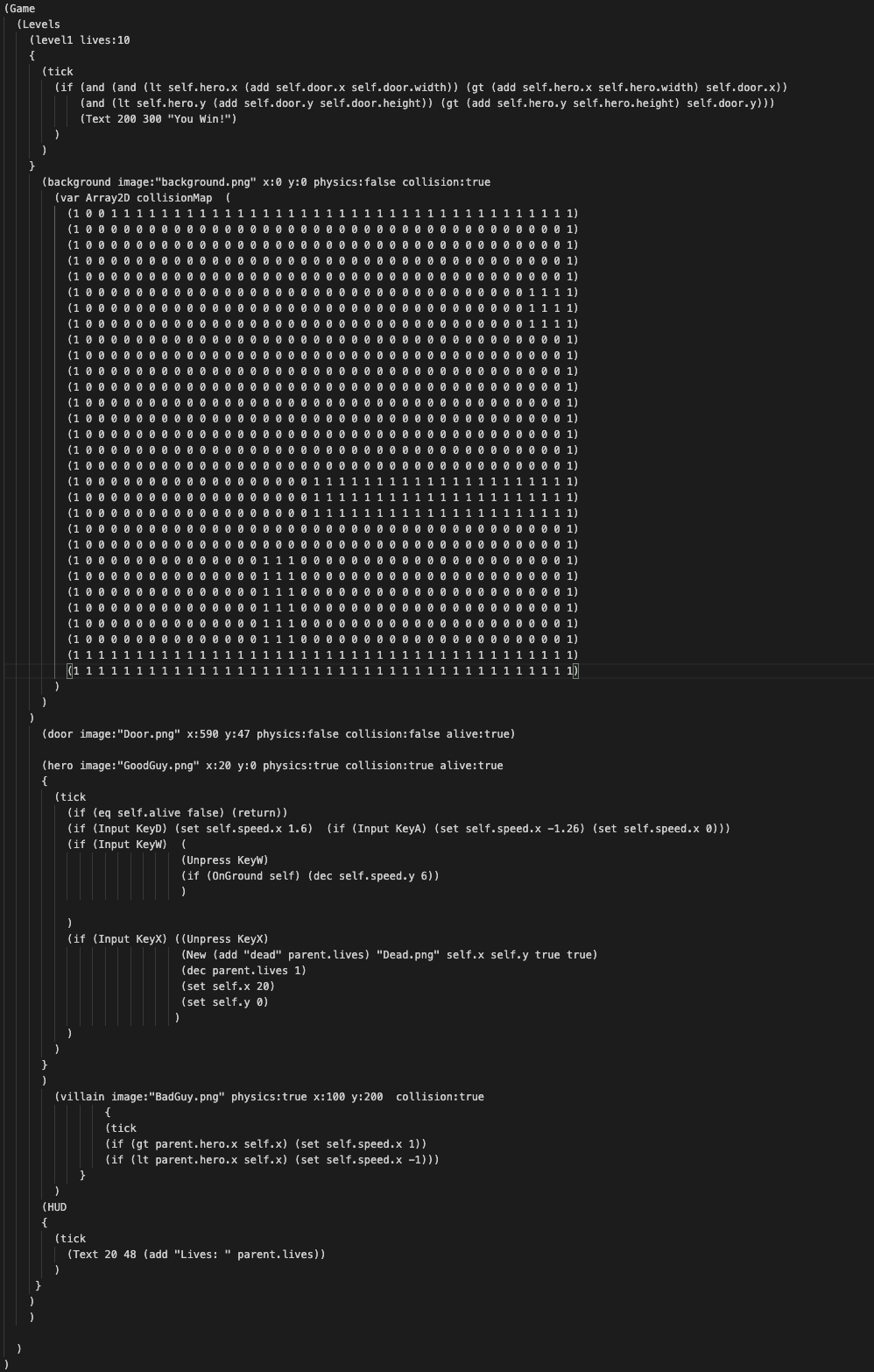 Having missed yesterday, I found another couple of quiet hours today to work on the language/compiler/game idea. It's coming along nicely I now have a reasonably capable language. A compiler I wrote in Haskell, that reads the language into an IR, does some trivial optimisations and slots in calls to my game engine and then writes out javascript. The game is sort of playable. Your player must sacrifice themselves to help their next incarnation reach the exit.